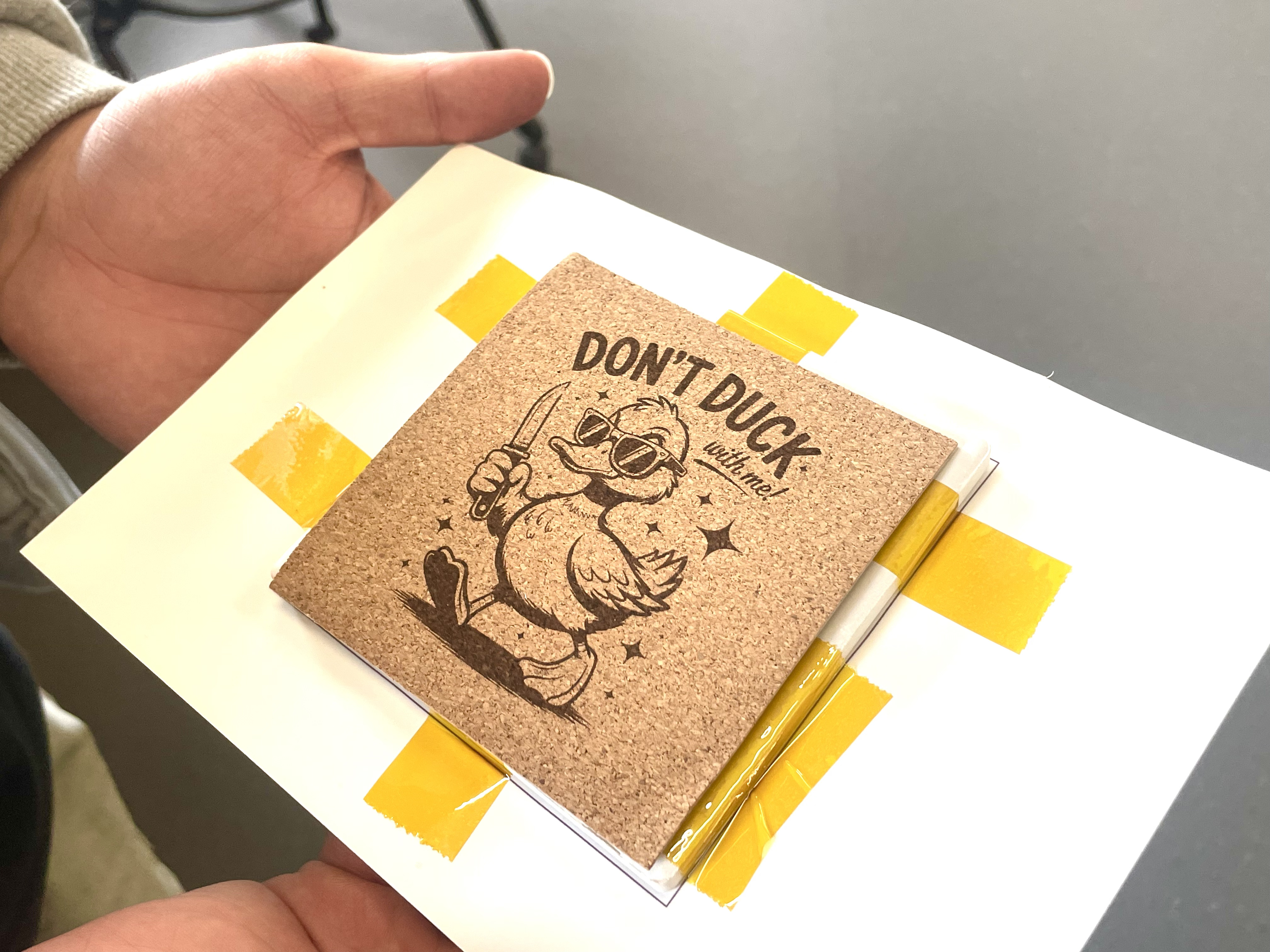 GGuided by the idea “Color in front, signature on the back,” participants created ceramic coasters that are both practical and personal. They first designed layouts and palettes in Canva, then sublimated their artwork onto the ceramic surface. Using the xTool F1, they laser-engraved handwritten signatures, icons, or quotes onto the cork backing—vibrant on one side, minimal on the other, with a story on both.